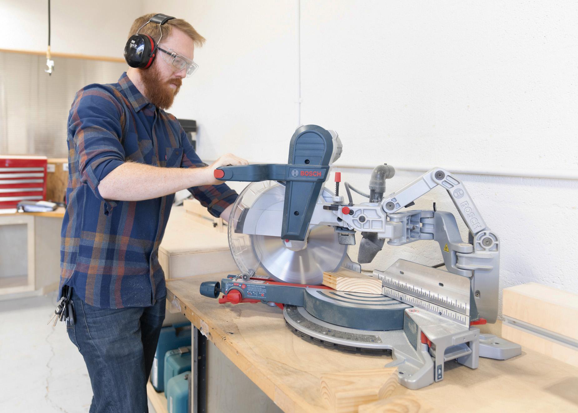 - A woodshop with a scroll saw, table saw, and vertical band saw