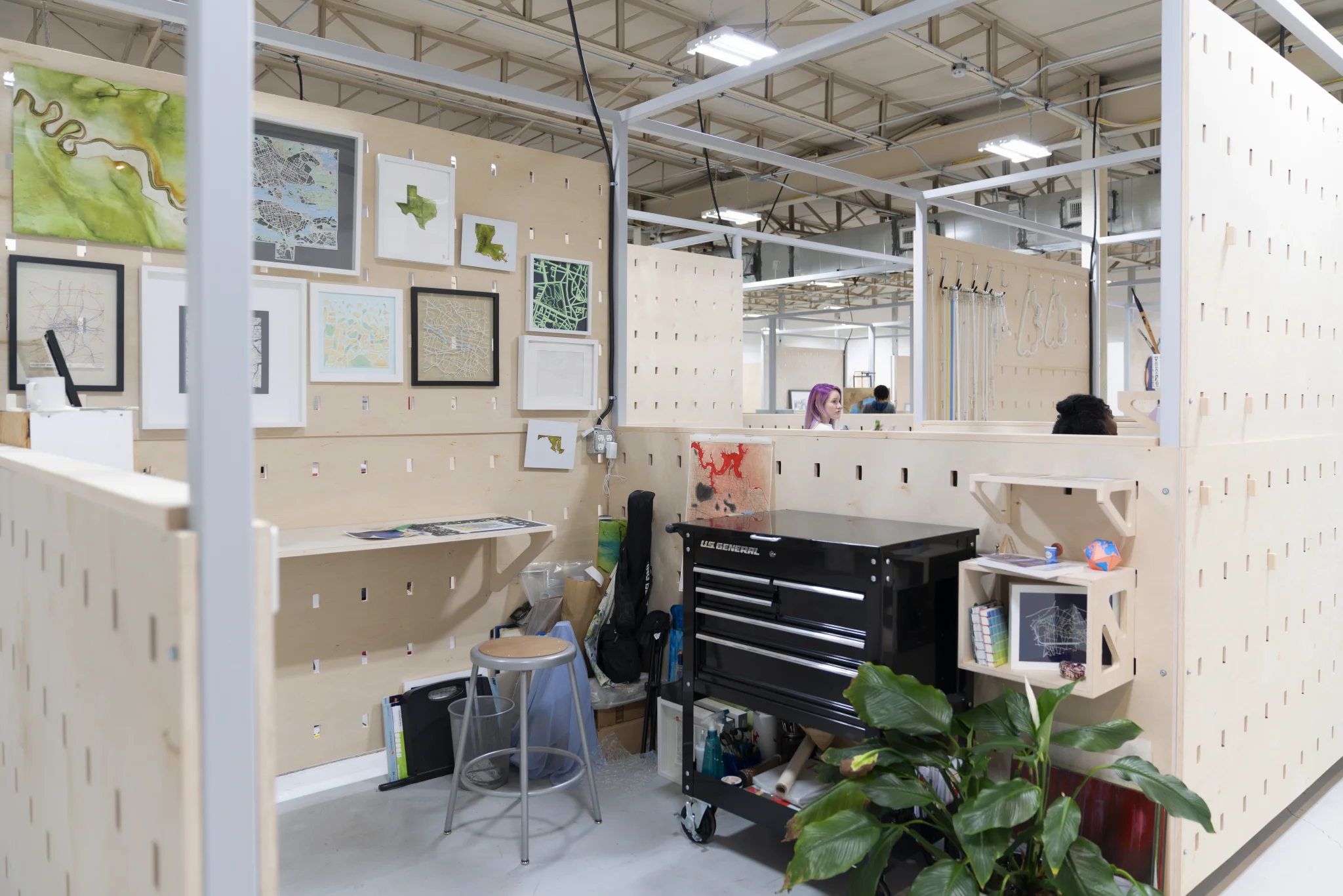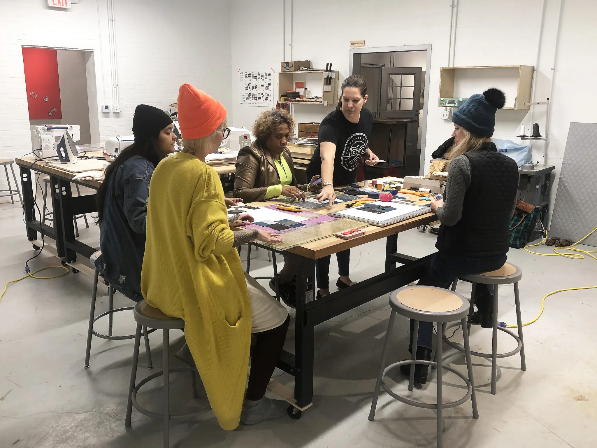 - A fabrication lab with tools and equipment including a Juki industrial sewing machine, basic photography lighting, projector, a letterpress, small etching press, workspace tables on casters, easels, and more